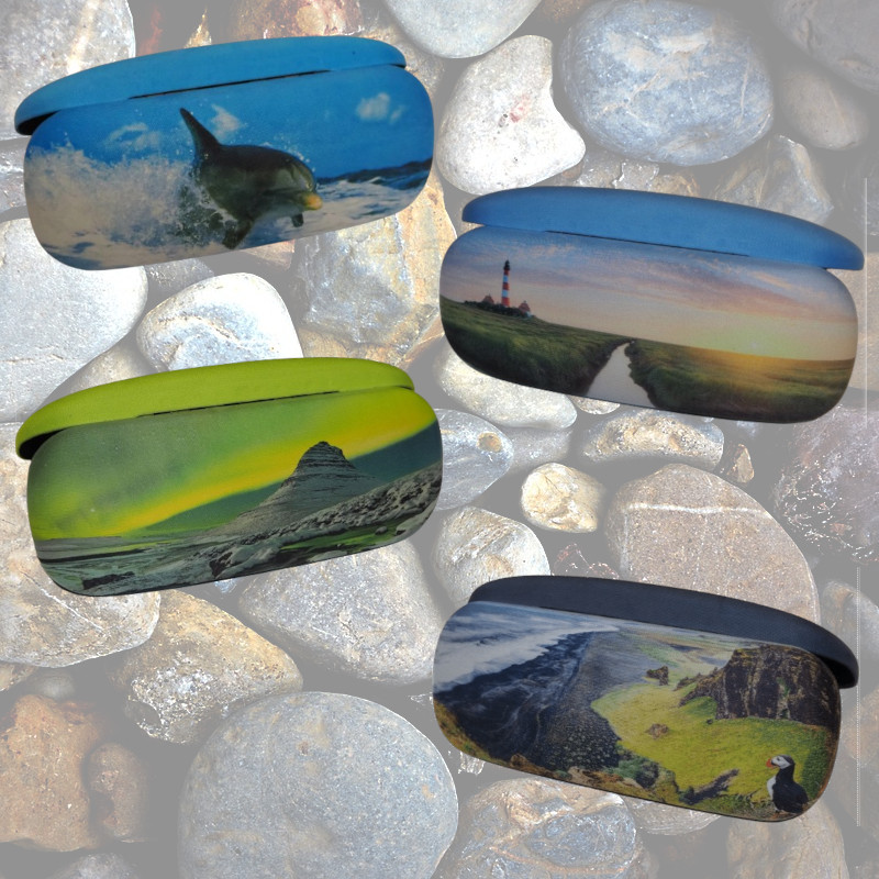 - Vier Exklusive Brillenetuis – Delfin, Küstenblick, Leuchtturm und Nordlicht